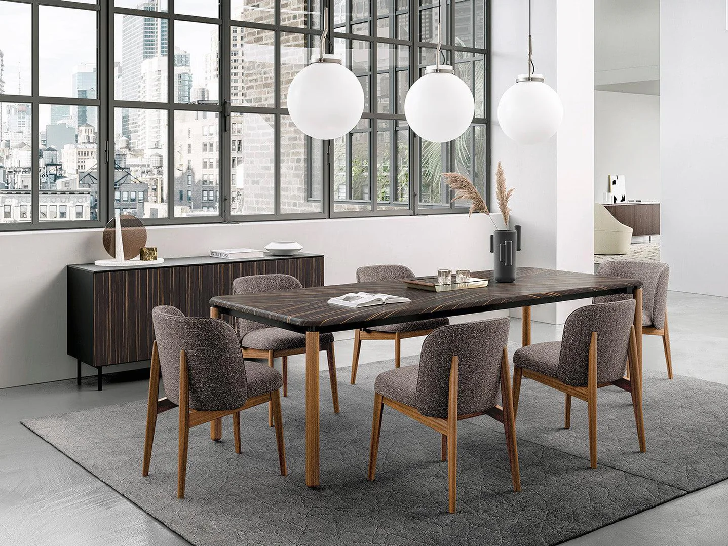 SPIGA – раздвижной стол с основанием из натурального дерева на цилиндрических ножках. Шпонированная столешница из эбенового дерева и центральной вставкой-бабочкой из черного лакированного дерева позволяет увеличить размер этого элегантного стола с 200 до 260 см..